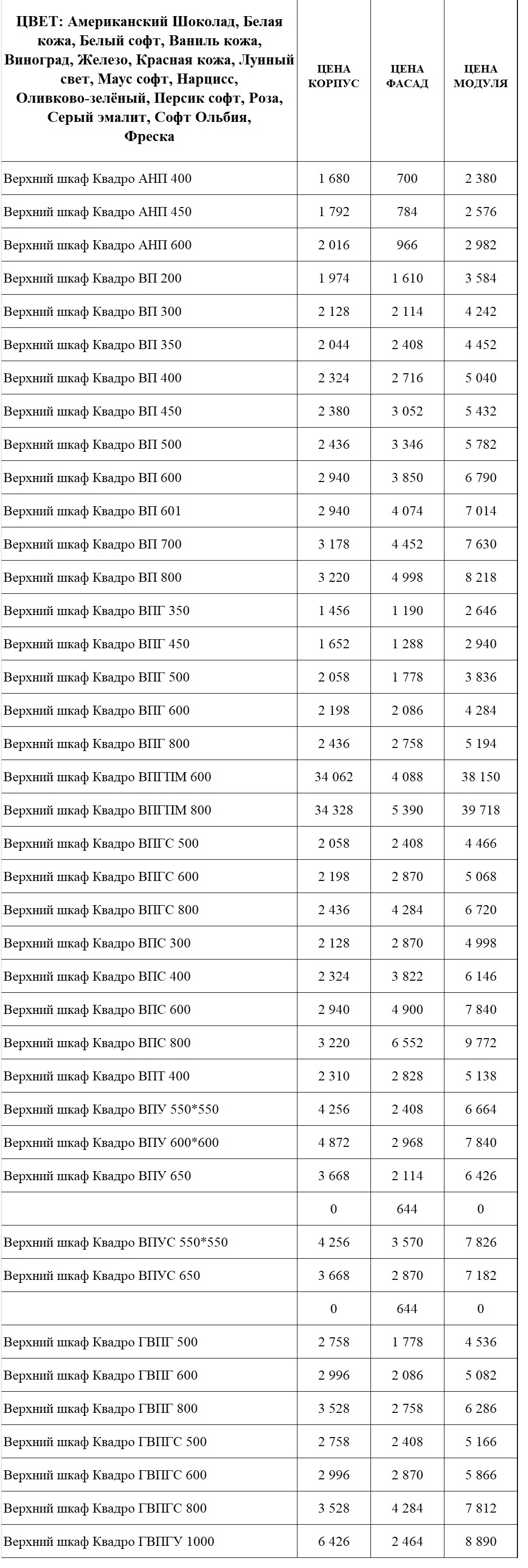 - фасад МДФ, цвета на выбор Американский Шоколад, Белая кожа, Белый софт, Ваниль кожа, Виноград, Железо, Красная кожа, Лунный свет, Маус софт, Нарцисс, Оливково-зелёный, Персик софт, Роза, Серый эмалит, Софт Ольбия, Фреска